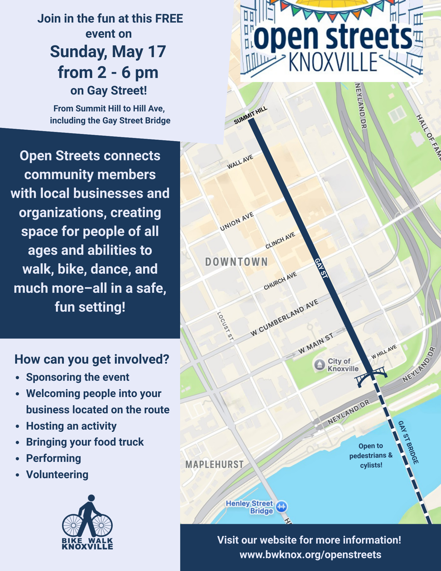 We are planning for this year's Open Streets event, and can't wait to see you all in the streets. Follow the link above to check out event details, and what makes Open Streets so special. Make sure you are following along on our social media channels for any updates and information leading up to the event. Get ready to walk, bike, roll, skate, and dance along Gay Street!